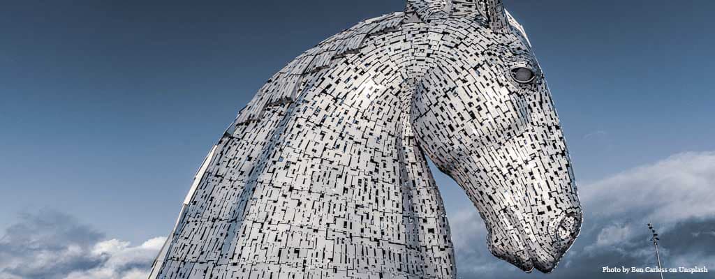 A Falkirk, vicino Edimburgo, si trovano due enormi sculture a forma di teste di cavallo che rappresentano i leggendari Kelpies, degli spiriti maligni appartenenti al folklore celtico.